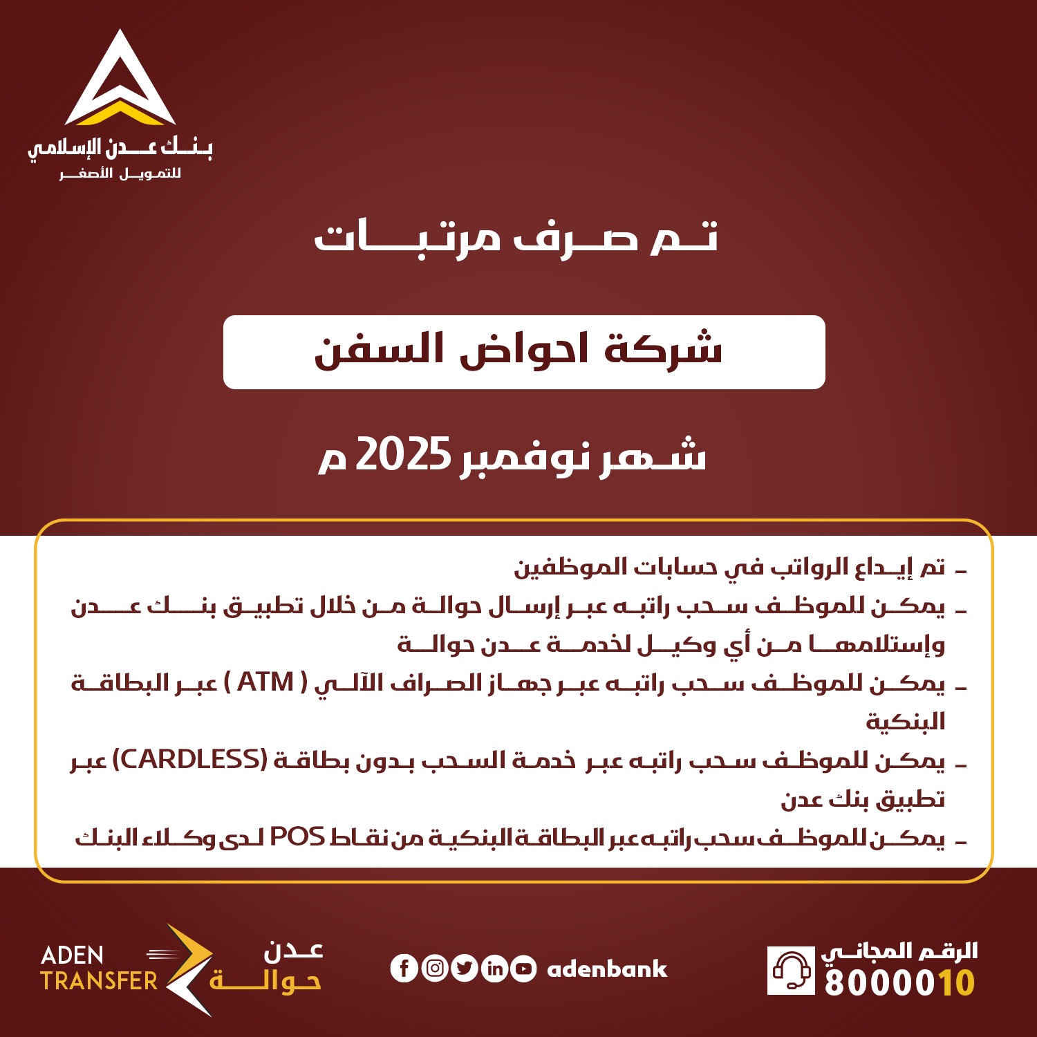 وأوضح بنك عدن أنه تم صرف مرتبات شركة احواض السفن – لشهر اكتوبر وديسمبر من العام 2025م