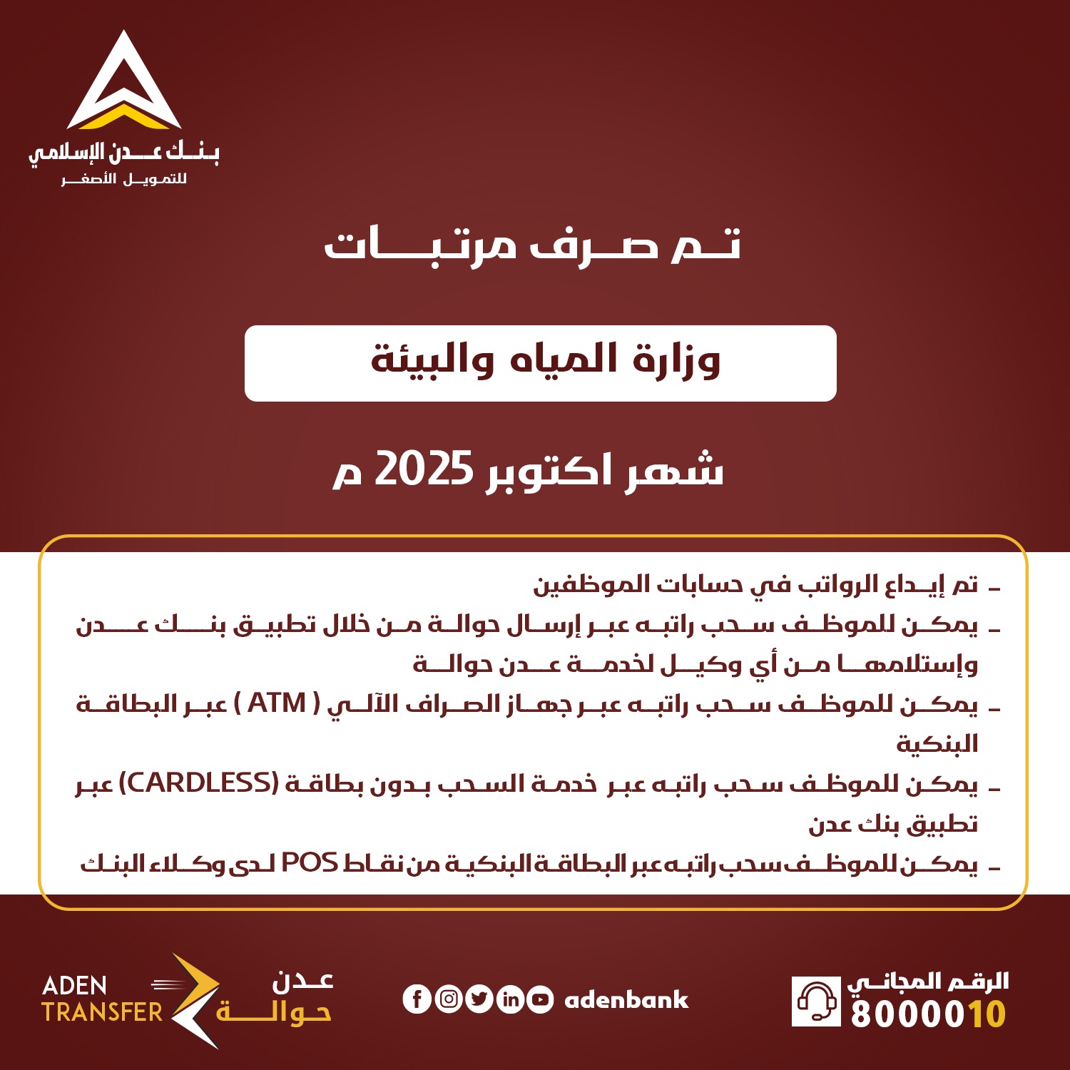 أعلن بنك عدن الإسلامي للتمويل الأصغر اليوم الاثنين ، عن بدء صرف مرتبات موظفي وزارة المياه والبيئة – لشهر اكتوبر 2025 م