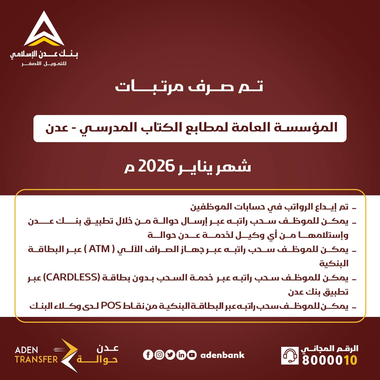 كما أشار بنك عدن أنه تم صرف مرتبات المؤسسة العامة لمطابع الكتاب المدرسي الإدارة التنفيذية – لشهر يناير