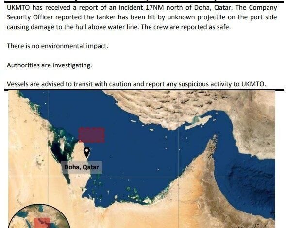 أعلنت هيئة عمليات التجارة البحرية البريطانية أنها تلقت بلاغًا عن تعرض ناقلة نفط لهجوم على بعد 17 ميلاً بحرياً شمال الدوحة.