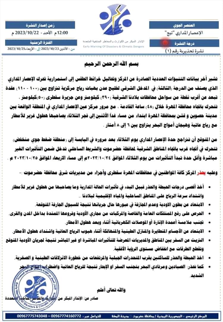 أصدر مركز الإنذار المبكر في محافظة حضرموت تحذير رقم (1) حول مستجدات الحالة المدارية في بحر العرب.