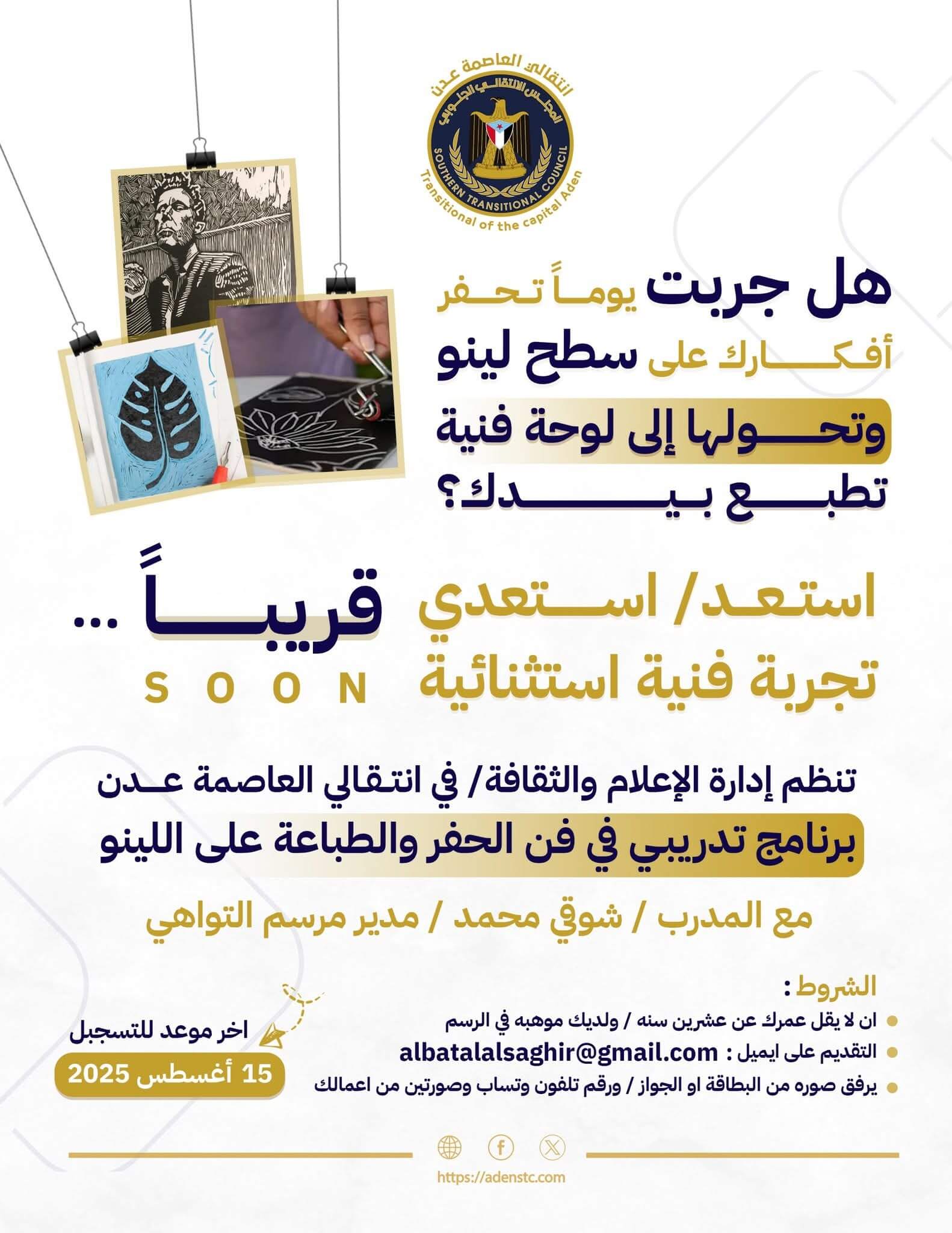 أخبار محلية انتقالي العاصمة عدن يقيم دورة تدريبية في فن الحفر والطباعة على اللينو 12 أغسطس 2025 العاصمة عدن/مكتب الإعلام/خاص: أعلنت إدارة الإعلام والثقافة في الهيئة التنفيذية للقيادة المحلية للمجلس