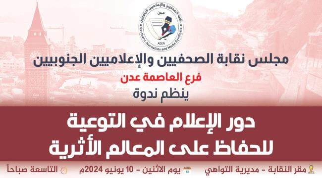 ثقافة وفن ندوة لنقابة الصحفيين الجنوبيين فرع عدن حول دور الإعلام في التوعية للحفاظ على المعالم الأثرية 8 يونيو 2024 العاصمة عدن “مكتب الإعلام” أمل عياش: ينظم مجلس نقابة الصحفيين والإعلاميين الجنوبيين فرع العاصمة