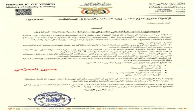 أخبار محلية العاصمة عدن.. وزارة الصناعة والتجارة توجّه بتشديد الرقابة الميدانية ومتابعة المخزون وتتوعد المتلاعبين 31 ديسمبر 2025 عدن /مكتب الإعلام/خاص: أصدرت وزارة الصناعة والتجارة تعميماً عاجلاً لمكاتبها في كافة المحافظات، يقضي