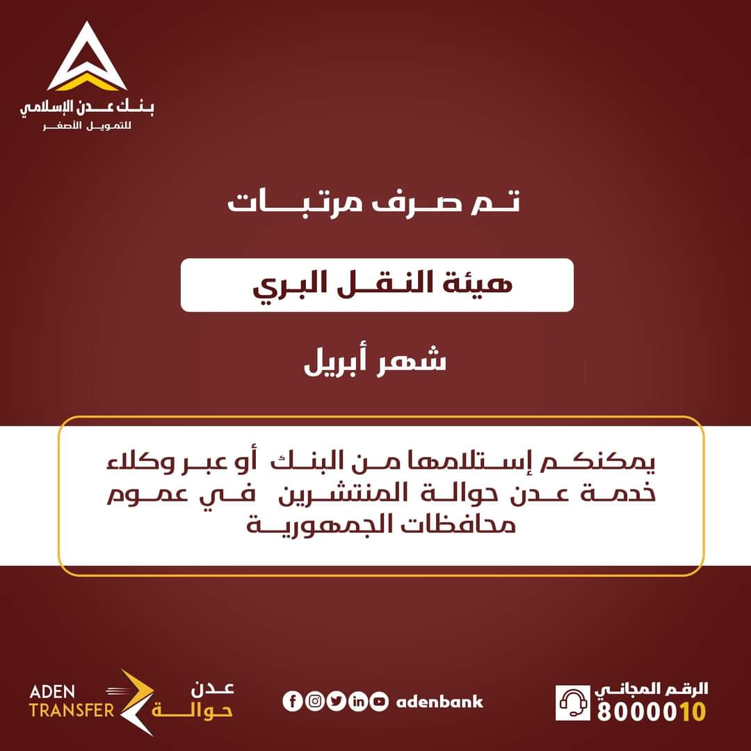 أخبار بنك عدن يعلن بدء صرف مرتبات هيئة النقل البري لشهر أبريل 25 أبريل 2024 العاصمة عدن “مكتب الإعلام “خاص: أعلن بنك عدن الإسلامي للتمويل الأصغر، اليوم الخميس