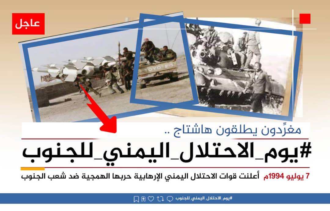 أخبار تزامنًا مع حلول الذكرى الـ(31) لاحتلال الشمال على الجنوب في 7 يوليو 94.. جنوبيون يطلقون وسم #يوم_الاحتلال_اليمني_للجنوب 6 يوليو 2025 العاصمة عدن” مكتب الإعلام “خاص: اطلق ناشطون وسياسيون جنوبيون، عصر اليوم الأحد 6 يوليو/ حزيران