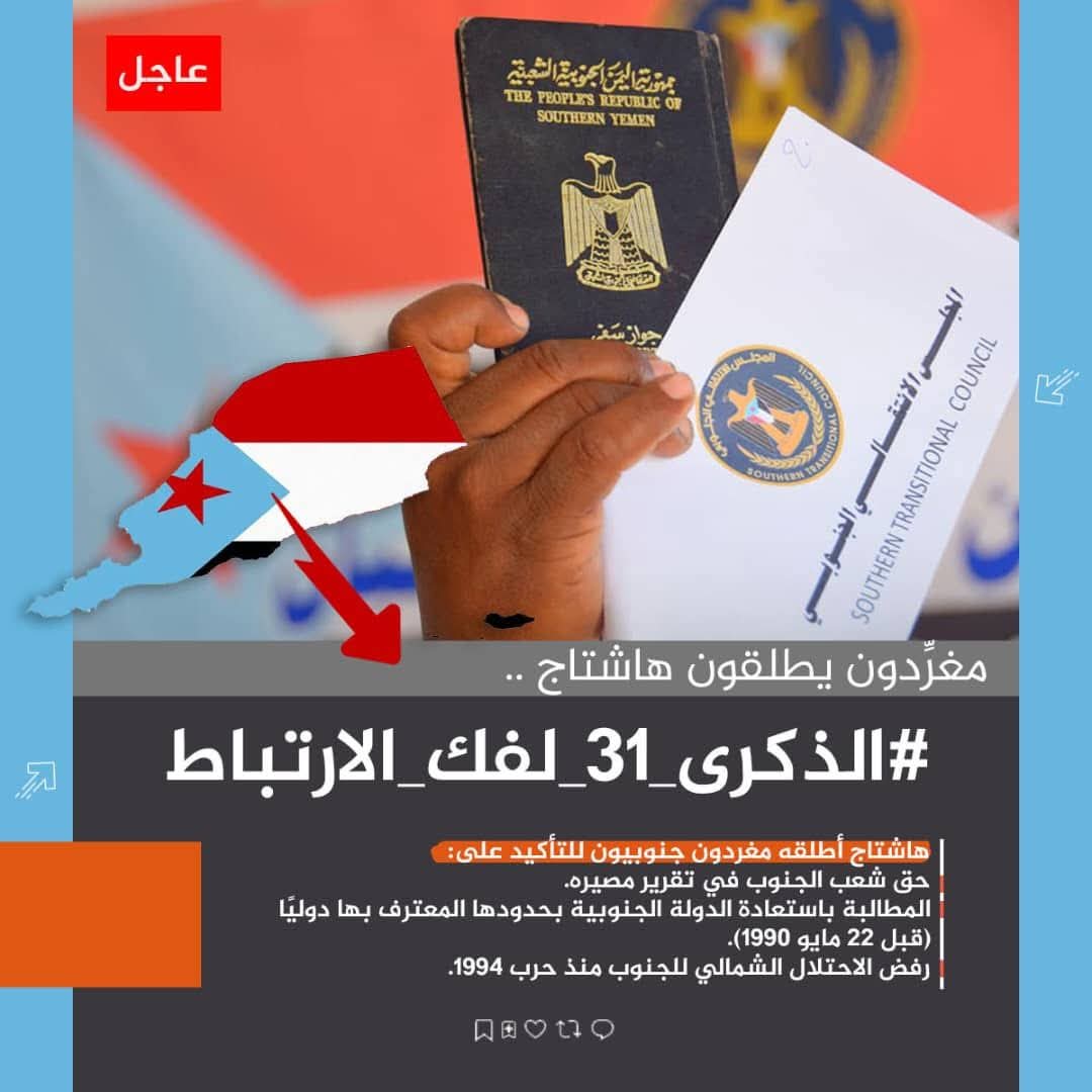 ملفات وتقارير جنوبيون يطلقون وسم #الذكرى31لفك_الارتباط ويجددون ثقتهم بالانتقالي بقيادة الرئيس الزُبيدي لاستعادة دولتهم 20 مايو 2025 العاصمة عدن” مكتب الإعلام” خاص: اطلق ناشطون وسياسيون جنوبيون، عصر اليوم الثلاثاء 20 مايو /