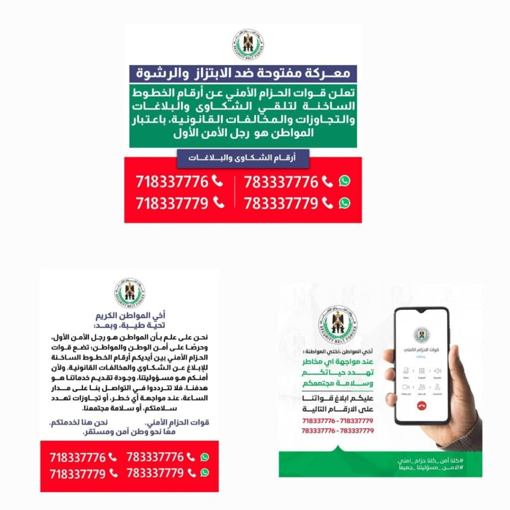 أخبار قوات الحزام الأمني تعيد نشر الخطوط الساخنة لتلقي شكاوى الابتزاز والرشوة والمخالفات القانونية 25 مايو 2025 العاصمة عدن/مكتب الإعلام/خاص: أعادت قوات الحزام الأمني، اليوم، اعادة نشر أرقام الخطوط الساخنة