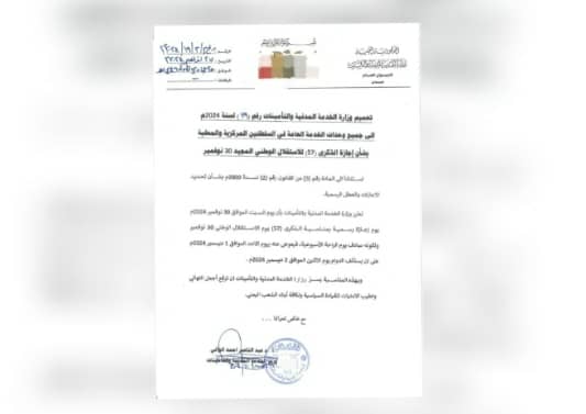 أخبار الخدمة المدنية بالعاصمة عدن تعلن الأحد القادم إجازة رسمية ( وثيقة) 27 نوفمبر 2024 العاصمة عدن” مكتب الإعلام” إعلام الوزارة: أعلنت وزارة الخدمة المدنية والتأمينات بالعاصمة عدن، في تعميم