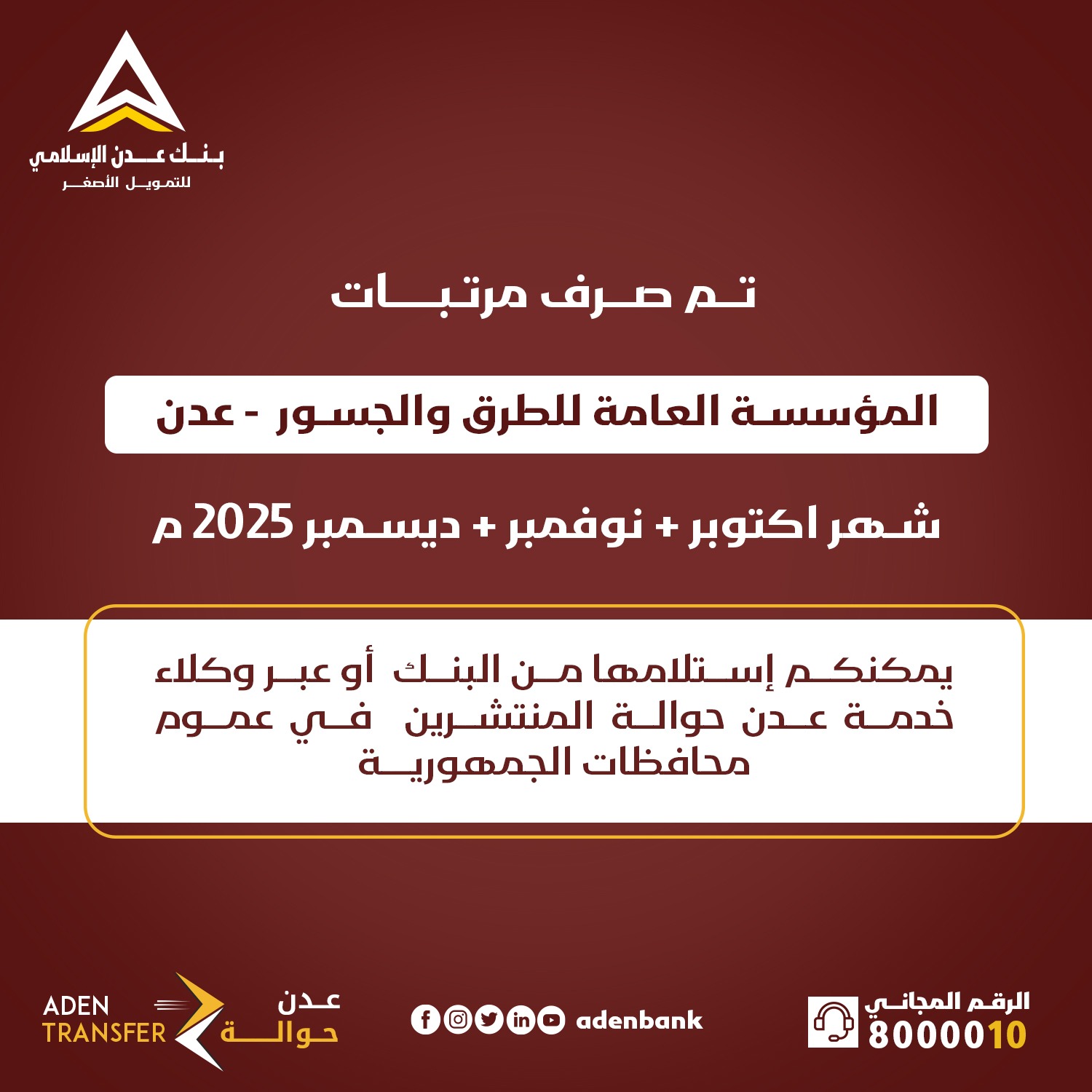 مواعيد المرتبات بنك عدن يعلن بدء صرف مرتبات المؤسسة العامة للطرق والجسور في العاصمة عدن لشهر أكتوبر ونوفمبر وديسمبر 30 ديسمبر 2025 العاصمة عدن” مكتب الإعلام “خاص: أعلن بنك عدن الإسلامي للتمويل الأصغر اليوم الثلاثاء ، عن