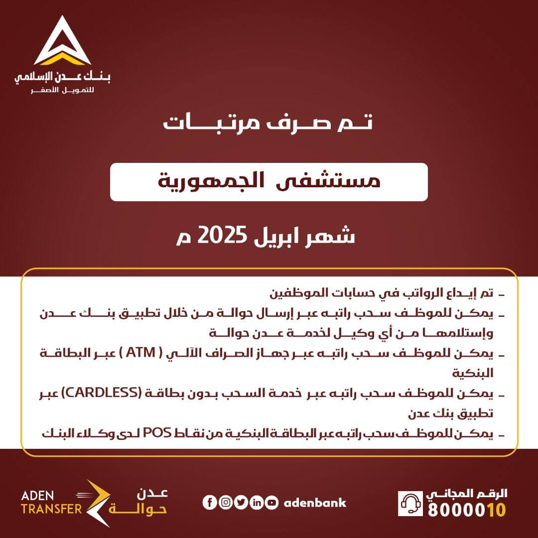 مواعيد المرتبات بنك عدن يعلن بدء صرف مرتبات مستشفى الجمهورية لشهر ابريل 2 يونيو 2025 العاصمة عدن” مكتب الإعلام “خاص: أعلن بنك عدن الإسلامي للتمويل الأصغر اليوم الأحد ، عن