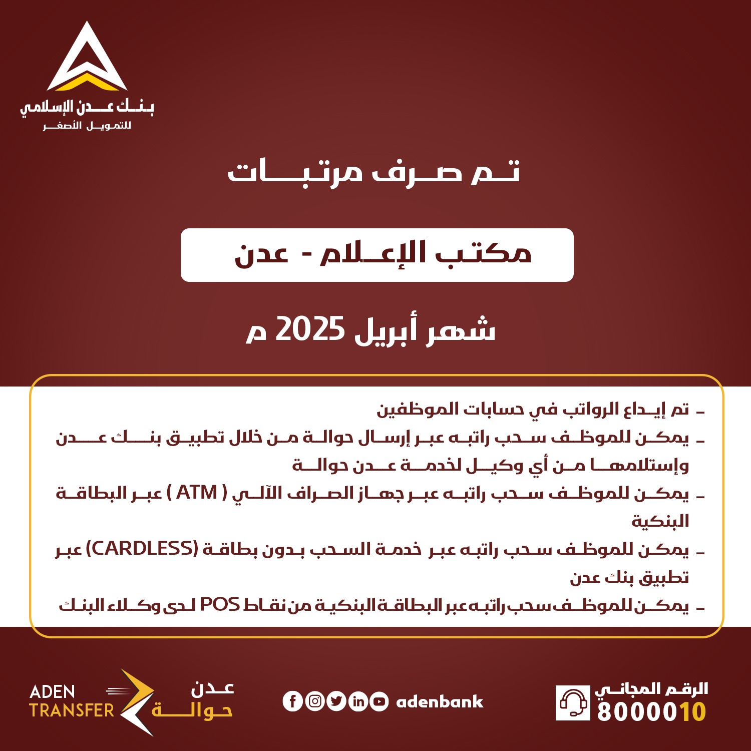مواعيد المرتبات بنك عدن يبدأ صرف مرتبات مكتب الإعلام بعدن لشهر أبريل 19 مايو 2025 العاصمة عدن” مكتب الإعلام “خاص: أعلن بنك عدن الإسلامي للتمويل الأصغر اليوم الأحد ، عن