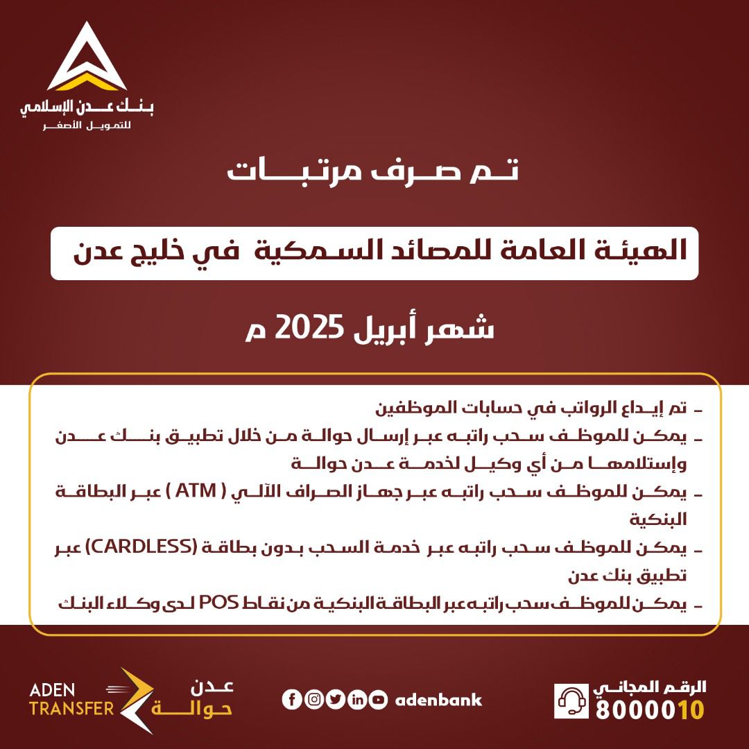 مواعيد المرتبات بنك عدن يعلن بدء صرف مرتبات الهيئة العامة للمصائد السمكية في خليج عدن – لشهر أبريل 19 مايو 2025 العاصمة عدن” مكتب الإعلام “خاص: أعلن بنك عدن الإسلامي للتمويل الأصغر اليوم الاثنين ، عن