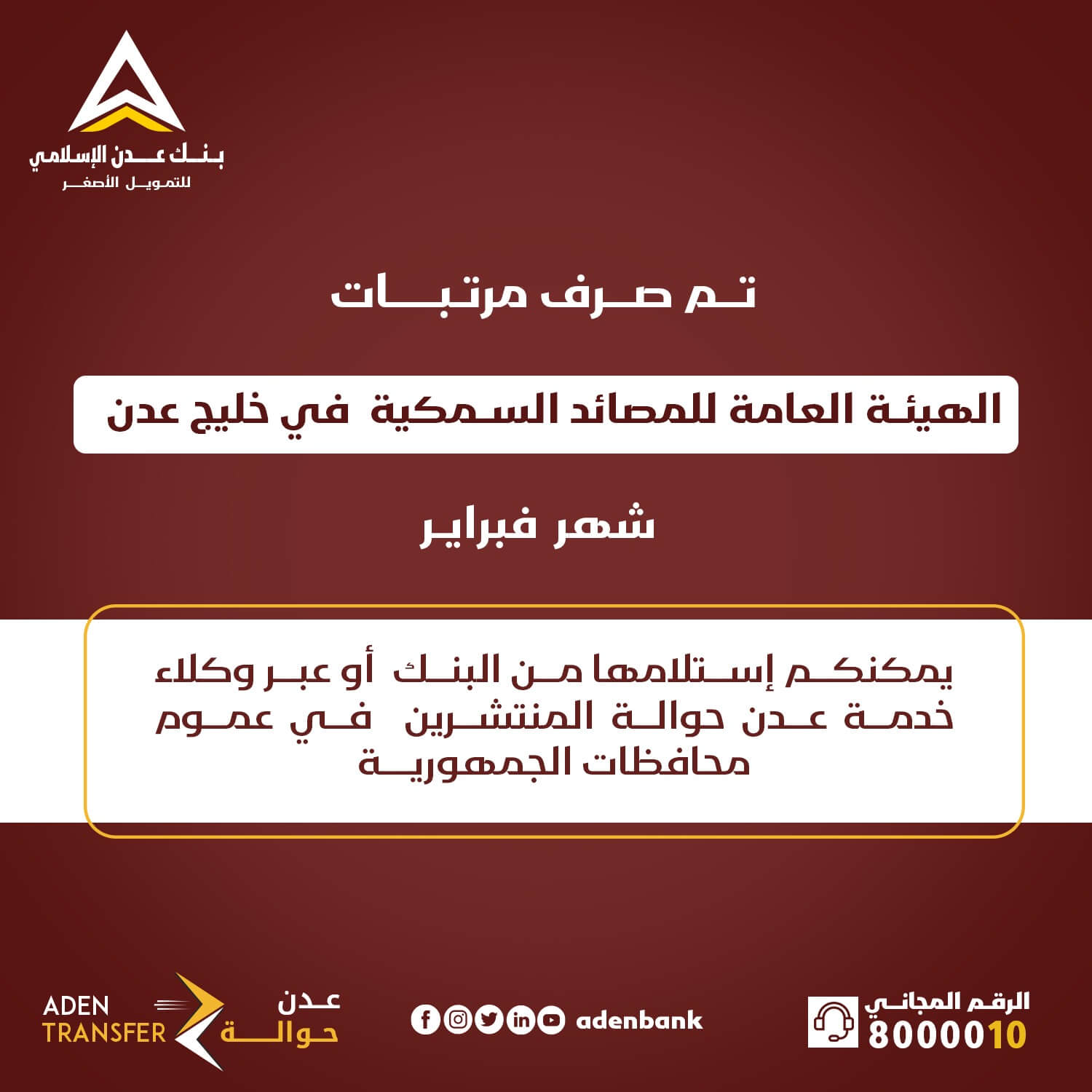 مواعيد المرتبات بنك عدن يعلن بدء صرف مرتبات موظفي الهيئة العامة للمصائد السمكية في خليج عدن لشهر فبراير 9 مارس 2025 العاصمة عدن “مكتب الإعلام” خاص: أعلن بنك عدن الإسلامي للتمويل الأصغر، اليوم السبت 9 مارس
