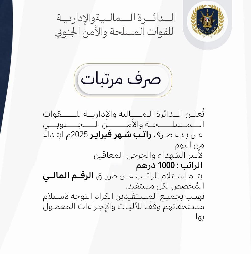 أخبار إعلان بشأن مرتبات شهداء وجرحى القوات الجنوبية لشهر فبراير 27 مارس 2025 العاصمة عدن/ مكتب الإعلام/خاص: أعلنت الدائرة المالية والإدارية للقوات المسلحة والأمن الجنوبي عن