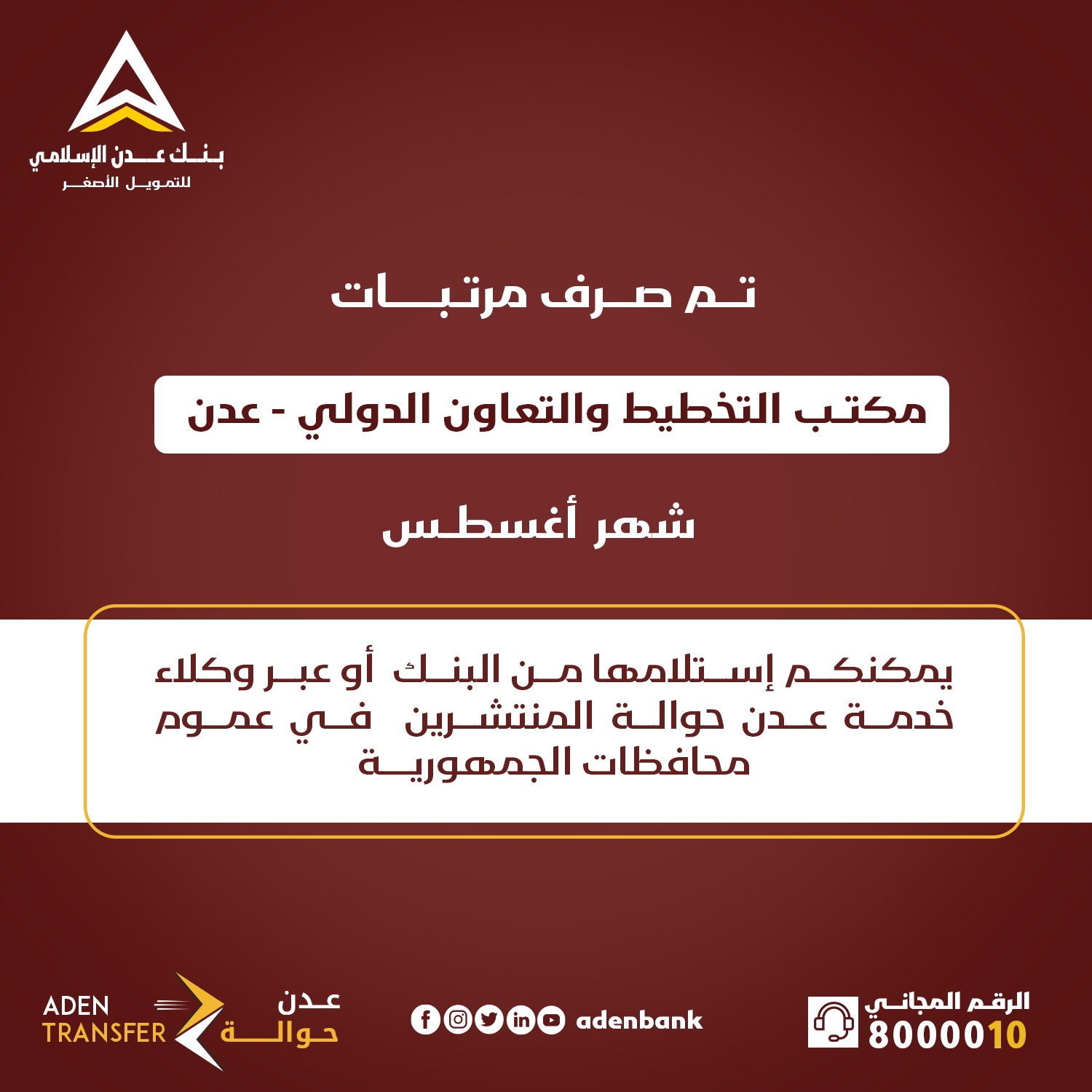 مواعيد المرتبات بنك عدن يعلن بدء صرف مرتبات صندوق تنمية المهارات لشهر سبتمبر 25 سبتمبر 2024 العاصمة عدن “مكتب الإعلام” خاص: أعلن بنك عدن الإسلامي للتمويل الأصغر، اليوم الأربعاء ، عن