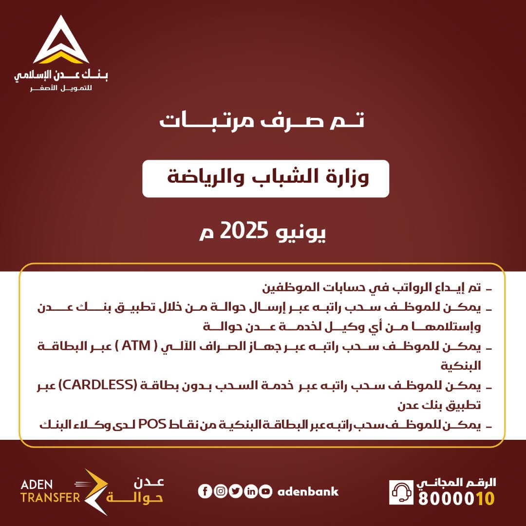 مواعيد المرتبات بنك عدن الإسلامي يعلن بدء صرف مرتبات وزارة الشباب والرياضة لشهر يونيو 12 أغسطس 2025 العاصمة عدن “مكتب الإعلام” خاص: أعلن بنك عدن الإسلامي للتمويل الأصغر، اليوم الثلاثاء ، عن